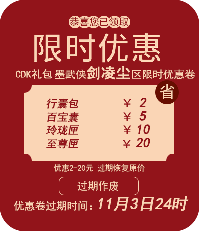为答谢各位少侠一路相伴,墨武侠两周年之际开启庆典大区【剑凌尘】,超值福利折上再送优惠券,多重福利、海量道具等你来拿!
