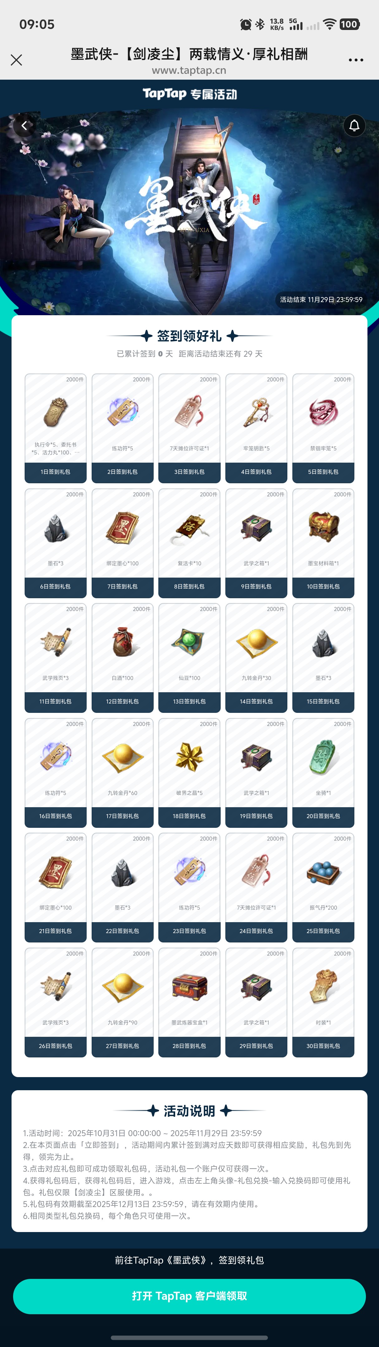 下载TapTap,进入墨武侠论坛,每次签到都可获得超多福利礼包和游戏道具!